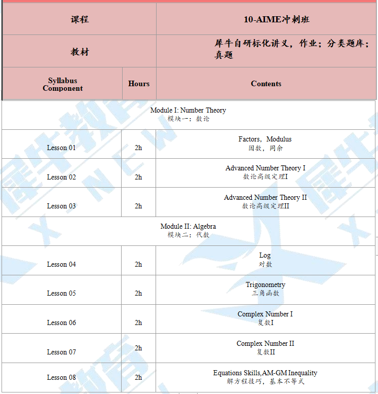 AMC10数学竞赛晋级AIME数学竞赛:集中讲解没有接触过或者接触得极少的知识点,例如代数部分,课程设置:数论6h+代数14h+组合4h+几何6h+复习模考,帮助考生补充至AMC12水平,培养解题能力和创新思维,针对性提高。