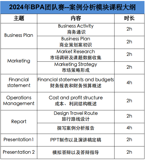 根据BPA的2个组别和3场研习,我们开设不同班型的课程。