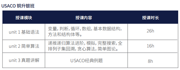 USACO是针对美国中学生乃至全球学生的计算机编程在线竞赛。USACO承担为每年夏季举办的国际信息学奥林匹克竞赛选拔美国队队员的重任,承担的责任相当于国内的NOIP比赛。如NOIP受中国名校关注一样,USACO备受美国名校关注,本身极具权威性。课程内容涵盖基础语法、简单算法、高级算法、数据结构、图论算法等多个方面,旨在帮助学生系统掌握竞赛所需知识,实现阶梯式通关。