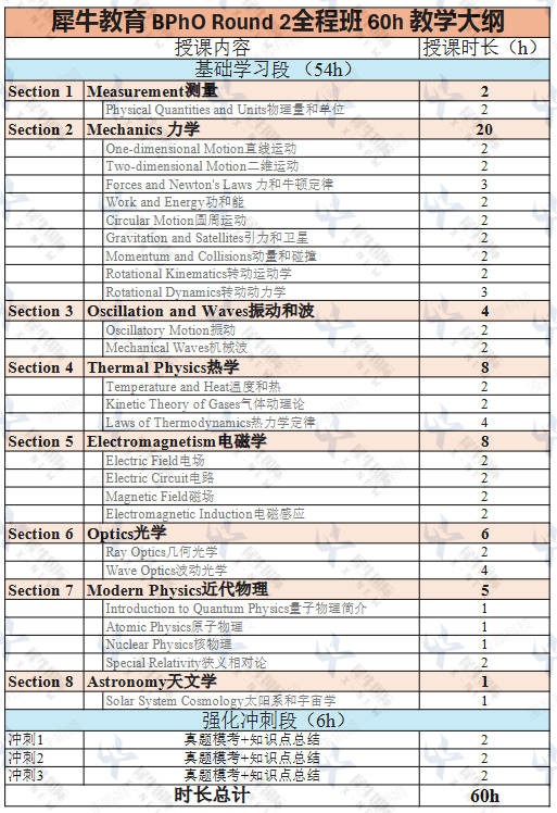 犀牛BPhO物理竞赛培训课程,将竞赛知识点与国际课程知识点重新整合,分单元提升知识广度和各板块深度,帮助学生建立牢固高效的物理分析框架,轻松应对海内外物理竞赛,英国剑桥、德国慕尼黑名师亲授,助力各位同学一次备考多项拿奖。