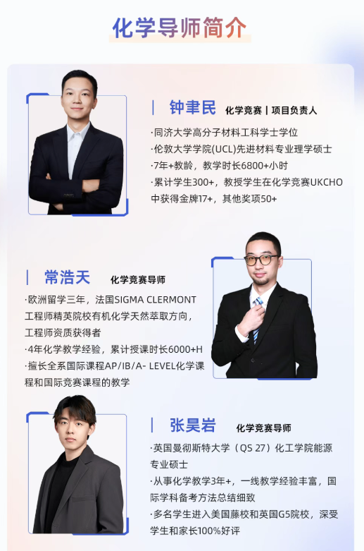 UKChO适合:目标英国G5.化学基础扎实,喜欢挑战超纲内容的学生;CCC适合:目标加拿大名校,想稳妥获奖,时间相对紧张的学生;USNCO适合:目标美国藤校,实验能力强,有志冲击国际赛事的学生