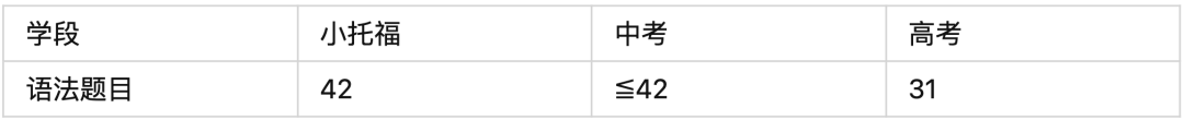 以下是小托福、中考、高考语法题量之间的对比: