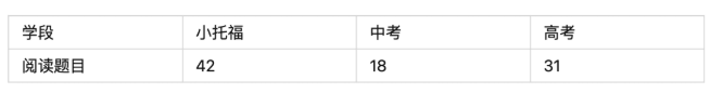 以下是小托福、中考、高考阅读题量之间的对比: