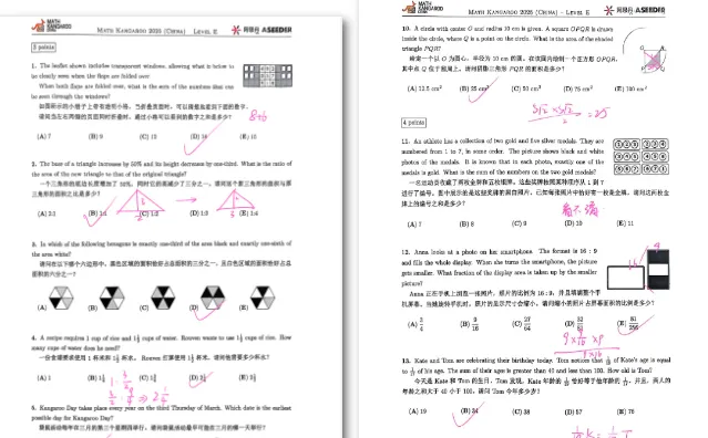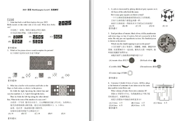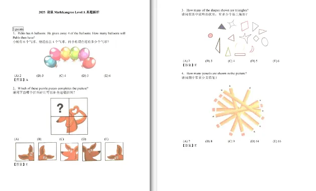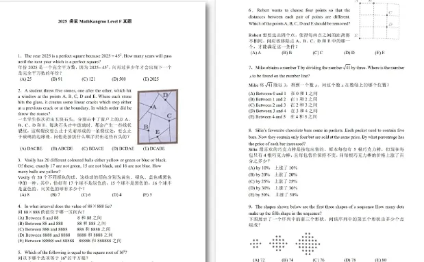以上就是小编整理的部分2025袋鼠数学竞赛真题,袋鼠数学竞赛因为其题目具有趣味性且比较简单,而且得奖率高,所以很多家长会选择将其作为AMC8竞赛的衔接。面向1-12年级学生都可以参加,但也有不少一年级甚至幼儿园大班的学生家长都开始咨询袋鼠竞赛。