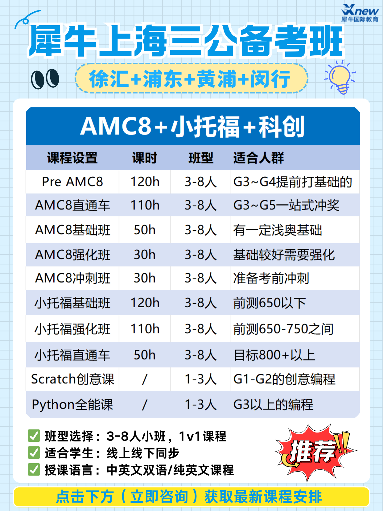 录取率0.51%!上海三公最后冲刺:AMC8+小托福+犀牛课程,错过再等一年!