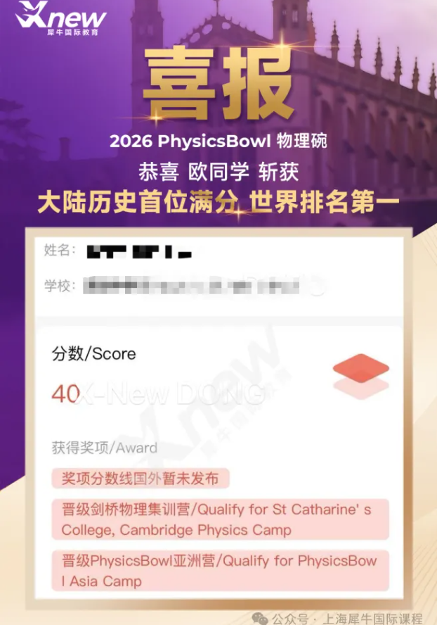 2026年物理碗竞赛已经出分了!同学们考的怎么样呢?犀牛学员们高分频出,并且出现大陆历史首位40分满分,世界排名第一,同学们的表...
