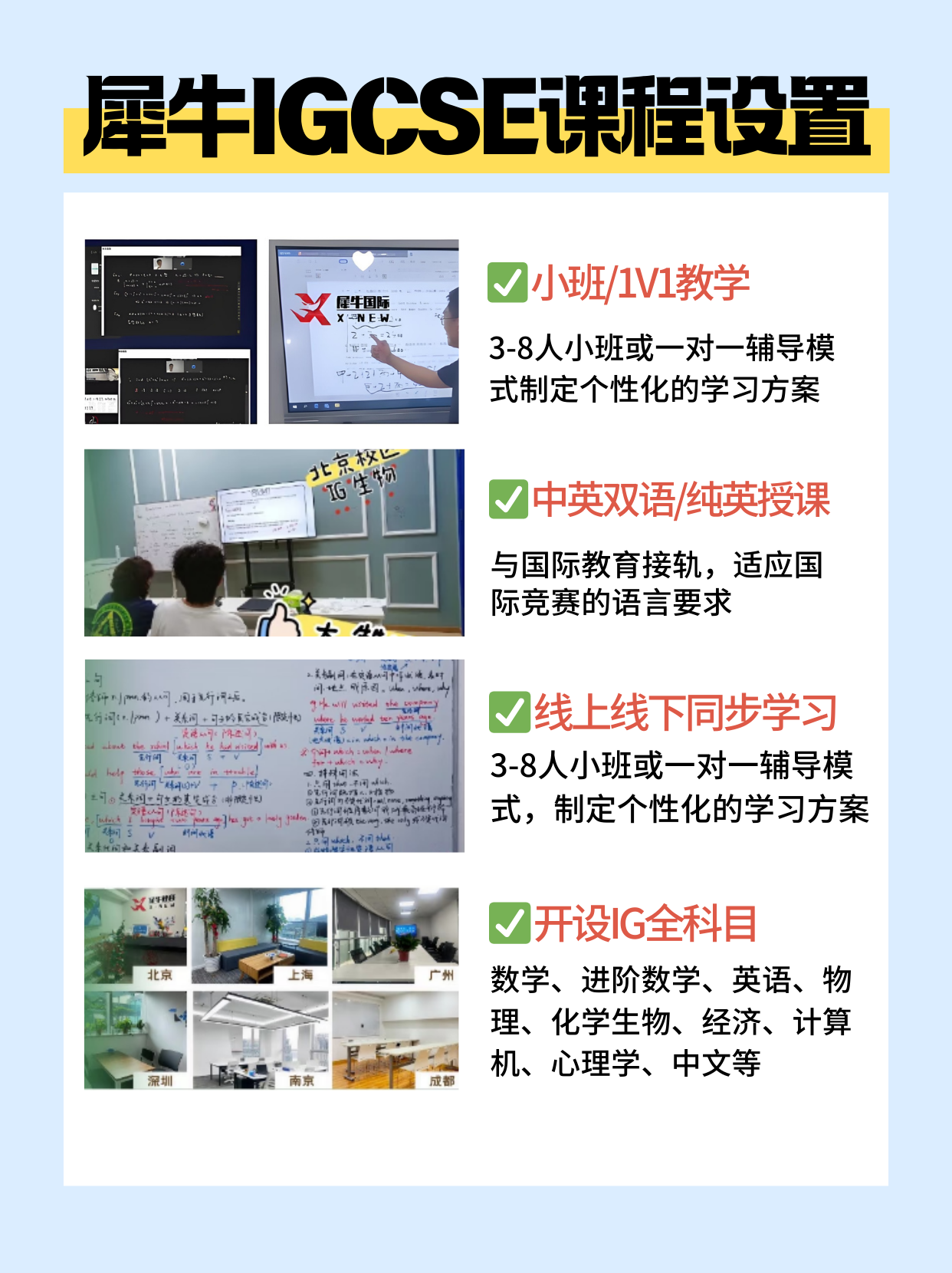2026-03-11 10:17犀牛IGCSE培训课程,1V1定制化规划,直通名校!犀牛IGCSE培训课程充分考量学生的个体差异,设计了丰富多元的班型,涵盖数学、英...