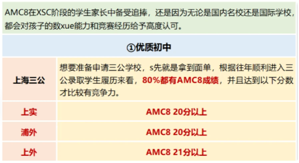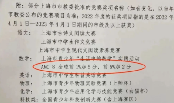 北京海淀六小强、上海三公、深圳四小还有一些比较厉害的中学都会把AMC8看做重要参考指标。在上海,AMC8被市教委正式列为小升初加分项!