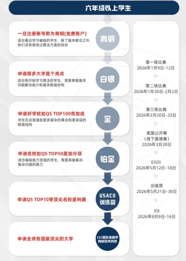 零基础学生:从青铜目标起步。首选C++,或Python作为入门过渡。重点掌握变量、循环、数组、函数等基础语法,刷完USACO官方青铜题库。目标首场晋级白银。