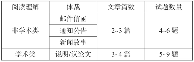 共42道单选题,对应6篇阅读文章,涉及校园生活内容(学校告示通知、校园报刊采访及新闻)、文学文体(第一人称叙事及第三人称叙事)、学术科普信息类文体;类似一个低配版托福阅读(托福阅读无文学文体)和SAT阅读(历史体裁)。