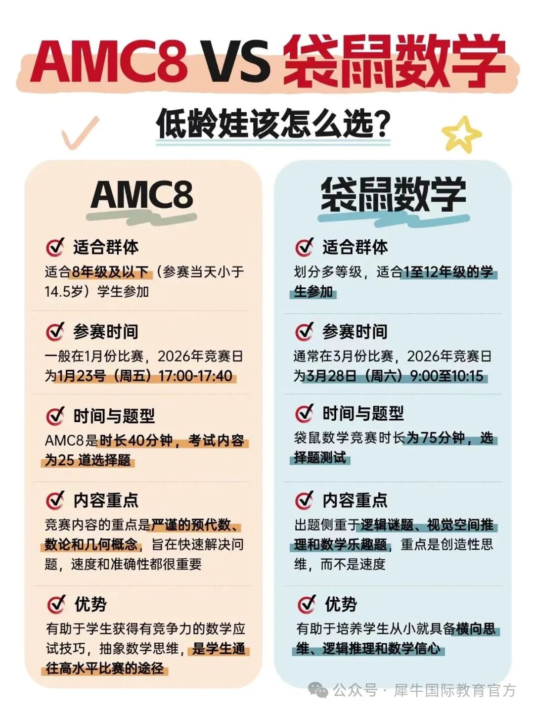 袋鼠竞赛侧重趣味数学、生活化题型,侧重培养孩子的数感和逻辑兴趣;而 AMC8 的考点完美承接袋鼠的知识体系,在基础运算、图形几何、逻辑推理、应用题的基础上,适度增加思维深度,不会出现断层式拔高,从小升初低年级开始提前备考完全合适。