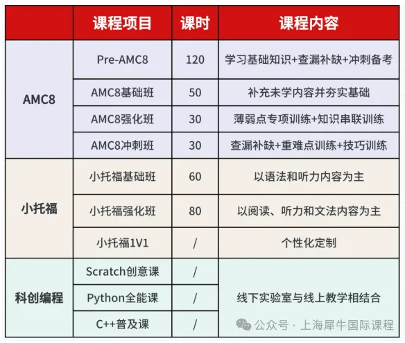 犀牛教育专门针对上海三公备考规划,开设了定制化的课程,不同年级的孩子都可以在犀牛找到适配的课程,AMC8+小托福课程辅导,帮助孩子数学+英语两手抓,高分稳稳拿下!