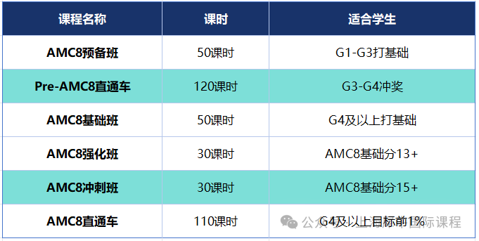 50小时,适合初次备考AMC8竞赛的学生,初步建立AMC8知识体系,补充AMC8竞赛知识点。