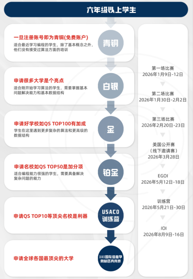 12年级(最后窗口):背景定稿前的终局之战。 基础较好的学生直接挑战黄金或铂金组,12月月赛是RD常规申请前唯一有效机会。若晋升铂金成功,在EDⅡ或RD文书中强调“持续精进的算法成长轨迹”,形成极其有说服力的申请信号。基础一般的学生可使用Python/Java快速入门积累白银及以上奖项,为材料增添计算机领域的技术素养。