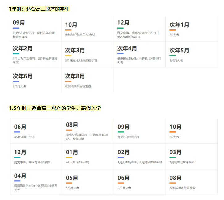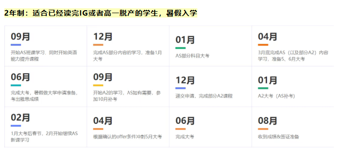 常规标准学制为 2 年,学生结合专业方向与自身优势,选读 3-5 门科目,完成全部考试即可获取 A-Level 成绩与官方证书。基础扎实、学习能力优异的同学,可选择一年速成规划,高效完成 3-4 门课程学习与考试,快速出分,缩短升学周期。