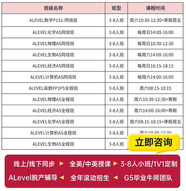 犀牛超强教研团队倾力打造专属暑期课程,开设A-Level 暑期先修班、全程精修班两大班型,按需灵活选择。专业师资精讲重难点、针对性突破易错考点、定制化规划学习方案,全方位高效提分。先人一步完成课程预习与能力拔高,新学期从容衔接 A-Level 高阶学习,轻松拉开差距,实现弯道超车,稳居年级优势!