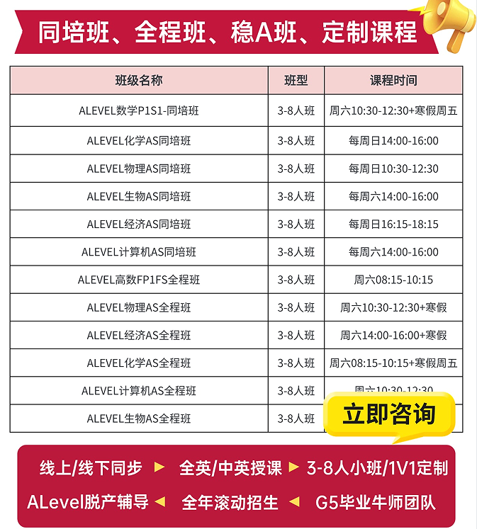 针对性补齐 IG 短板、预习 A-Level 新知,线上线下同步授课,小班精授 + 一对一定制,精准适配不同基础学生,暑期高效蓄力,新学期稳步领跑。
