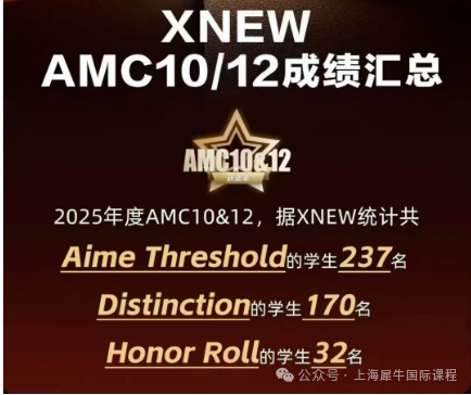超237名学生晋级AIME,170位学员拿到AMC10前5%,32位同学拿到了AMC10前1%!AMC10课程选犀牛就对了!犀牛是做AMC竞赛培训起家 的,分层课程设置,拒绝 “一刀切”,支持中英双语、全英授课,全国30+校区线上线下可选~