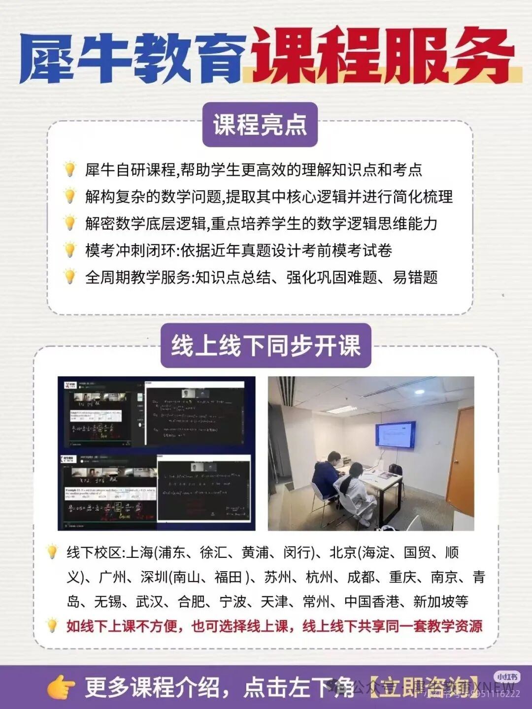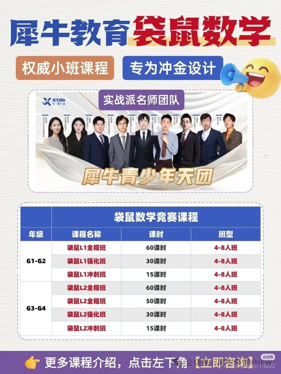 无论孩子选择哪条赛道,专业的指导都能让备考事半功倍。犀牛教育针对 AMC8 和袋鼠数学,都推出了体系化的小班课程,由实战派名师团队授课,助你轻松拿奖!