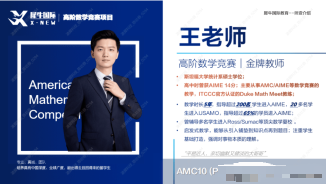 王老师(斯坦福大学统计系硕士):AIME 14分,Duke Math Meet官方教练;