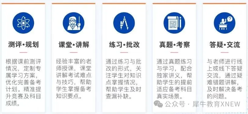 犀牛教育以测评・规划为起点,根据课前测评为学生定制专属学习方案;通过课堂・讲解由经验丰富的老师系统梳理考点与技巧;再以练习・批改帮助学生定位知识短板、查漏补缺;接着通过真题・考察配合独家讲义,让学生提前适应考试场景;最后辅以答疑・交流,通过线上线下的疑难精讲,及时解决备考中的各类问题