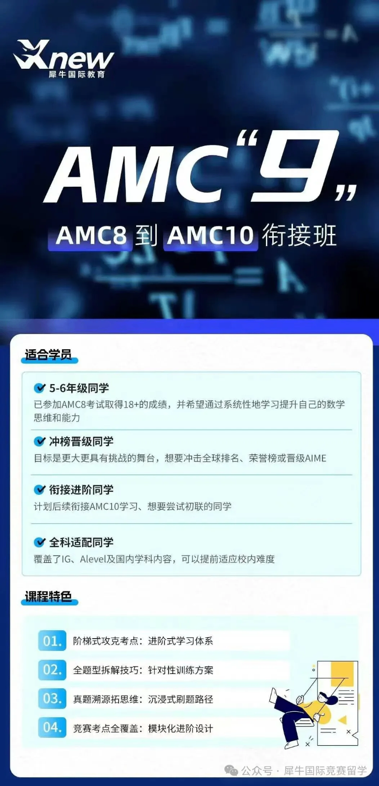 为了帮孩子精准跨越 AMC8 到 AMC10 的断层,犀牛国际教育推出了「AMC9」衔接班 ,专为 AMC8 取得 18 + 分的 5-6 年级学生设计,让衔接更高效、更有针对性。