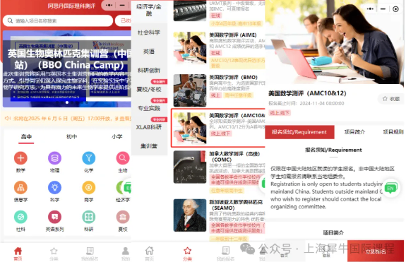 犀牛国际教育在上海/北京/苏州/深圳/无锡/南京等开设有校区,线上线下结合,是出国留学考试的一体化留学服务平台,包含:国际学科,国际竞赛,留学申请,语言咨询等。