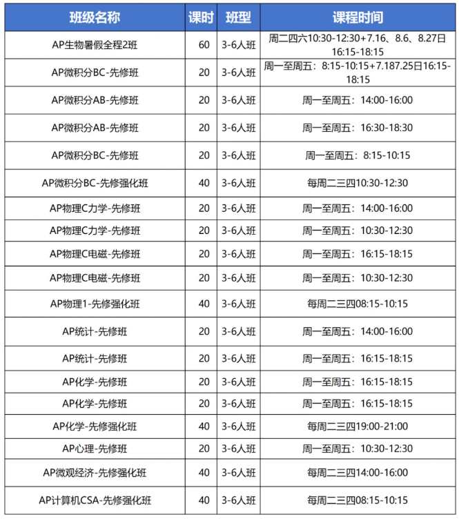犀牛针对不同阶段备考AP课程的同学开设有专门的AP先修班、AP培优班、AP强化班、AP冲刺班等课程,线上/线下同步上课,满足不同阶段同学们的备考需求。