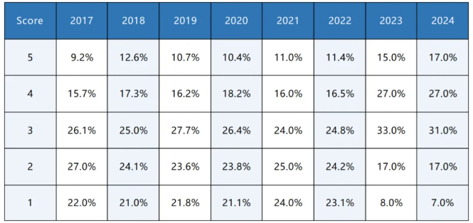 对比其他的AP课程,AP化学的5分率整体非常低。