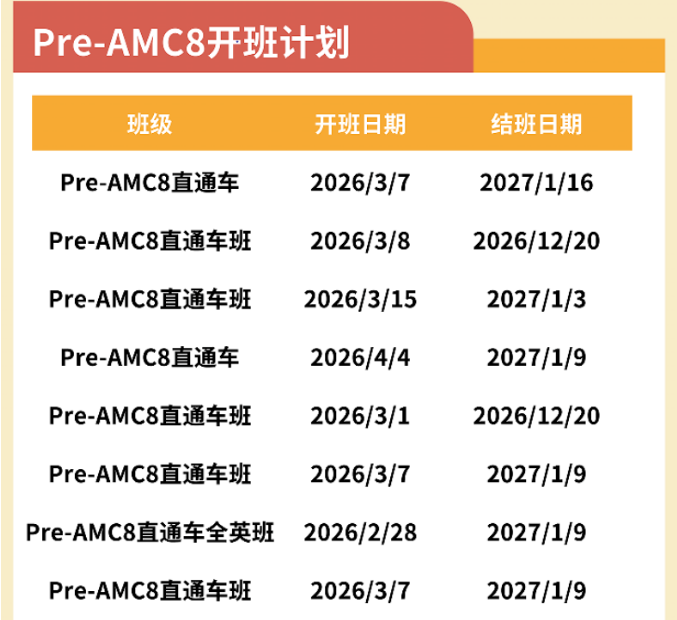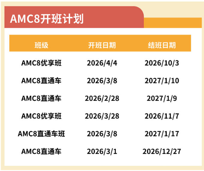 新赛季AMC8备考的黄金窗口期就在当下——3月正是系统打基础、抢跑全年的最佳时机!犀牛教育2026春季AMC8直通车全线发车,覆盖Pre-AMC8到AMC8全阶段,80h优享班高效提分、120h直通车稳扎稳打,更有全英班加持,满足不同基础孩子的出分需求。