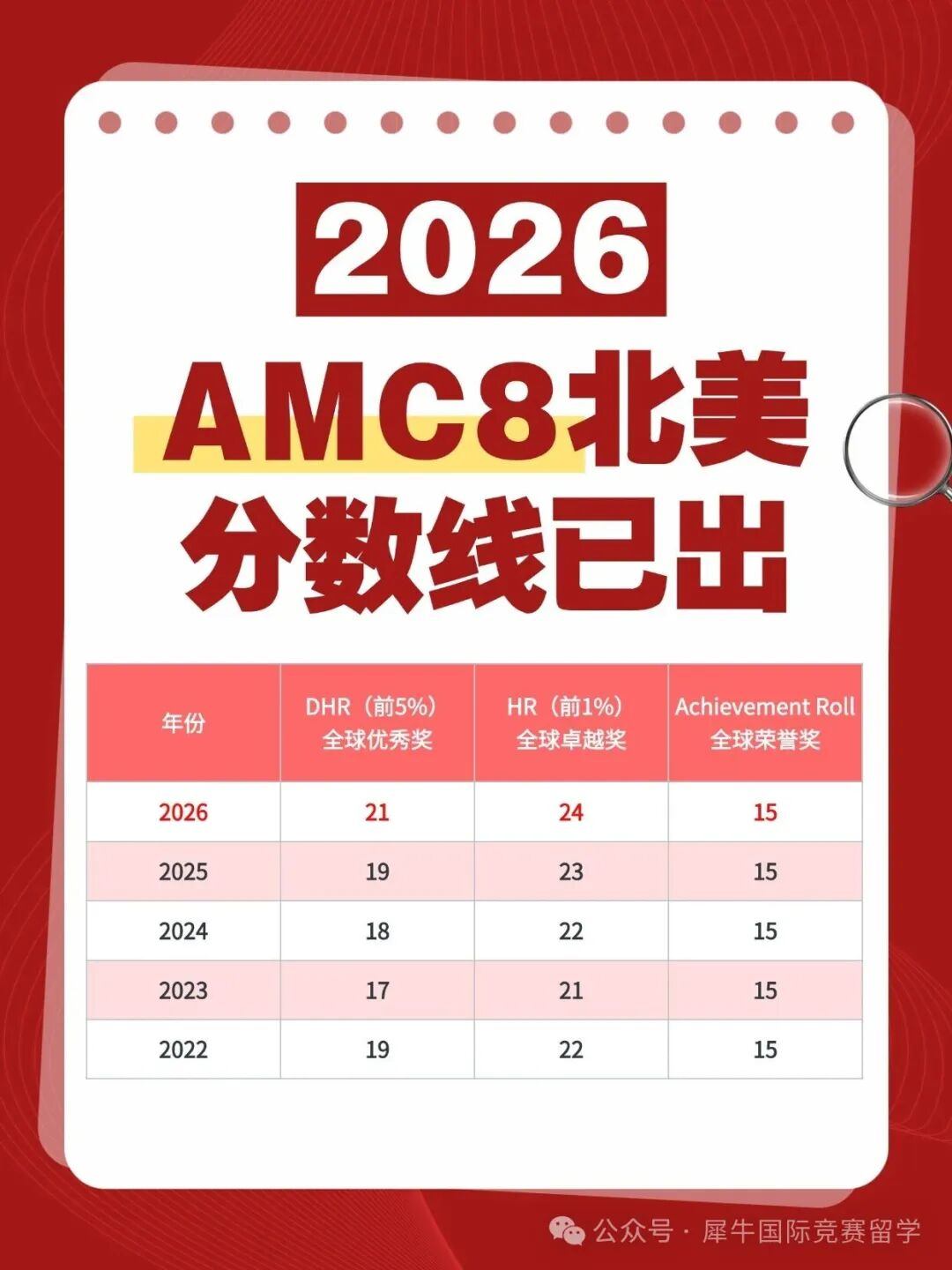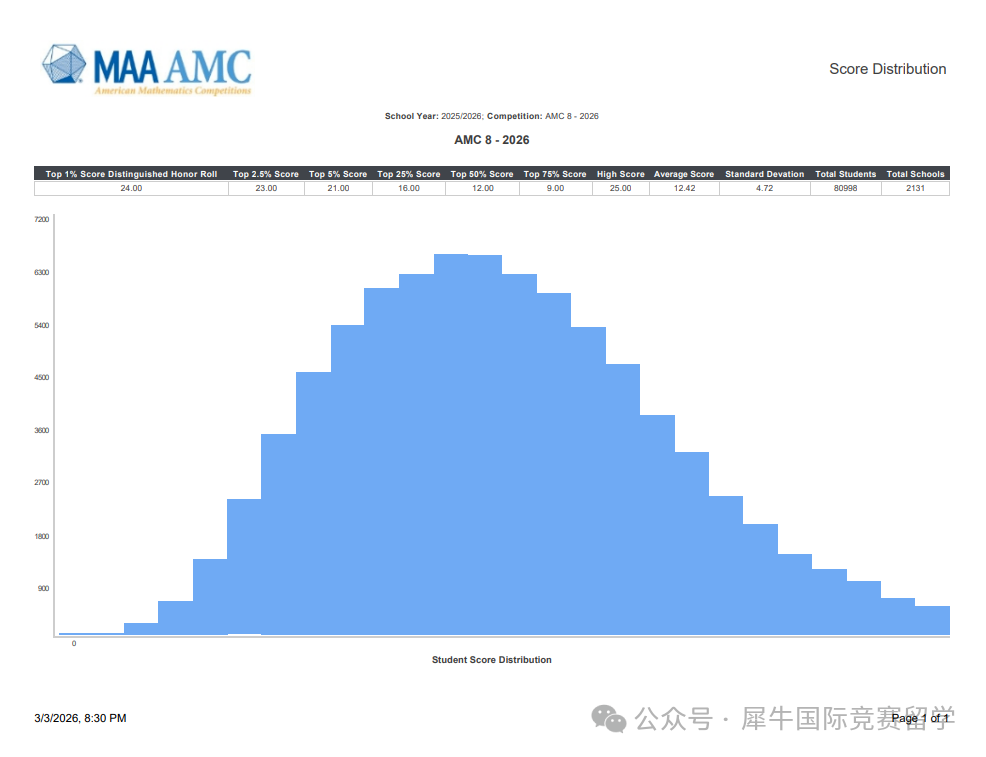 2026 年 AMC8 北美分数线正式公布,在无数家庭和学生的期待与忐忑中,今年的分数线再次刷新了历史新高! 越来越多的孩子提前布局竞赛,备考资源的普及让 “高分选手” 不再稀缺。今天老师就为大家解读最新分数线,附AMC8考后进阶建议,助大家在数学国际竞赛的道路上越走越远!
