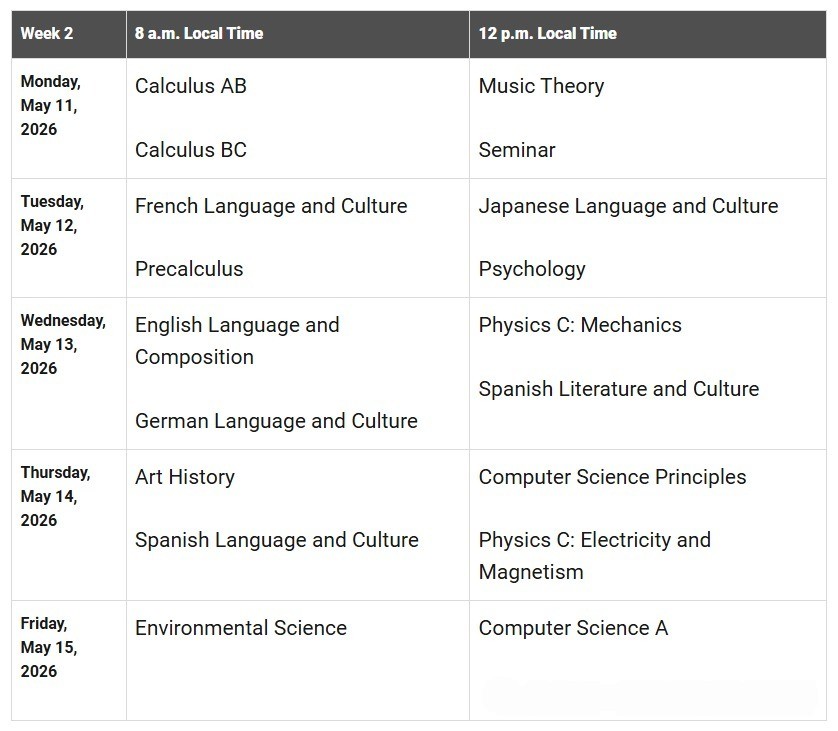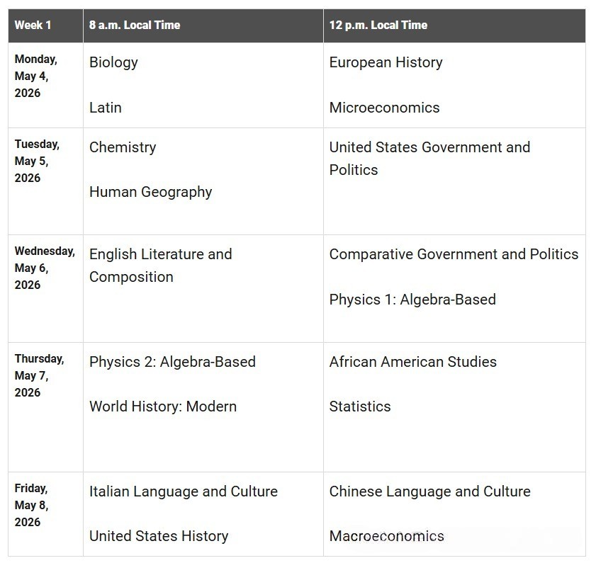 2026 年 AP 常规考试分两周进行:5 月 4 日 —8 日(第一周)、5 月 11 日 —15 日(第二周),每天分上午 8:00、下午 12:00两场(当地时间)。