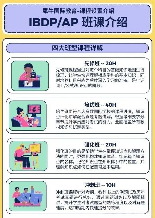 犀牛国际教育针对AP课程辅导开设了AP先修班、AP培优班、AP强化班、AP冲刺班等培训课程,线上线下同步教学,中英、全英均可授课。