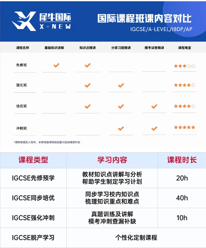 犀牛IGCSE课程培训班开设有IGCSE先修班、IGCSE强化班、IGCSE冲刺班,包含科目有数学、物理、化学、生物、计算机和经济等热门科目~