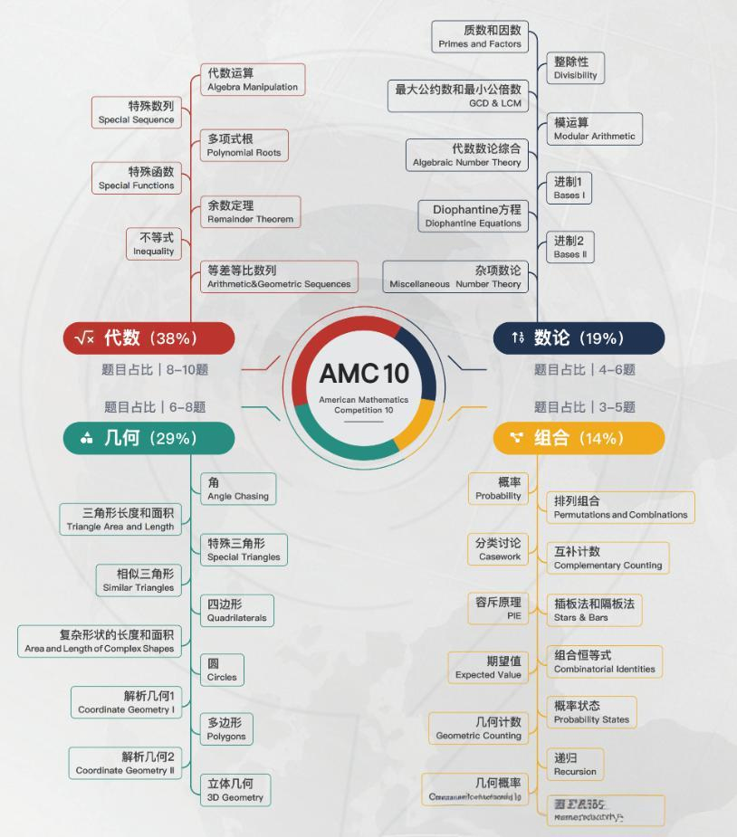 根据多年试题分析,AMC10主要涵盖四大模块:代数、几何、数论、组合。