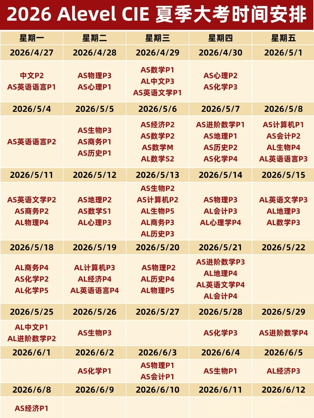 以下为爱德思、CIE和AQA考试局5月大考的时间安排