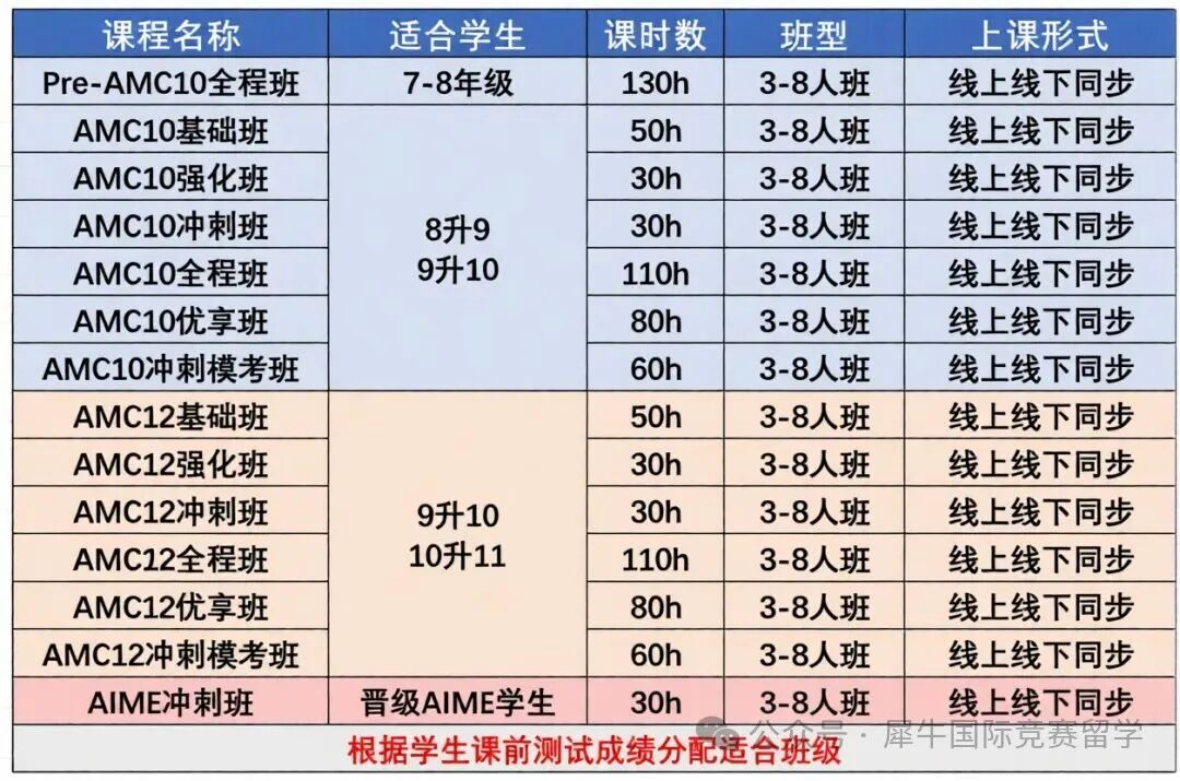 犀牛教育为不同基础的学生提供了多种班型,包括Pre-AMC10课程全程班、AMC10基础班、强化班、冲刺班等,满足不同阶段学生的学习需求。