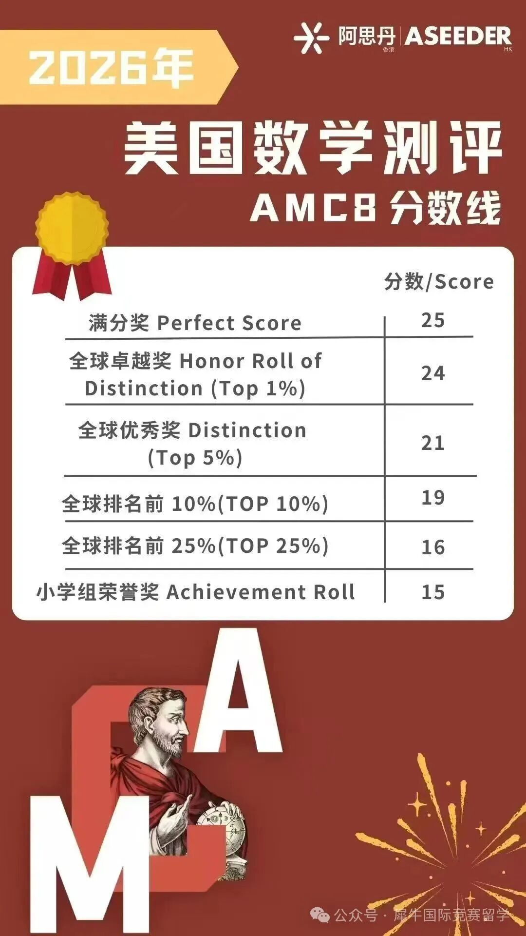 2026年AMC8中国区分数线正式出炉!阿思丹分数线与美区完全同步,创下近年全球卓越奖(前 1%)24 分、全球优秀奖(前 5%)21 分的历史新高;中国区组委会则为全球卓越奖(前 1%)22 分、全球优秀奖(前 5%)18 分。