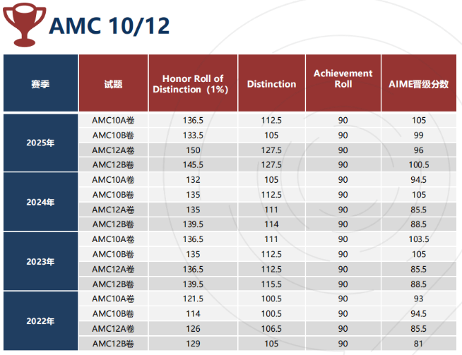 全球荣誉奖:体现了低年级学生的数学潜力。对于8年级及以下学生,能够在AMC10中获得90分以上,表明已经掌握了超出年级水平的数学知识,具备了参加高级数学竞赛的基础能力。