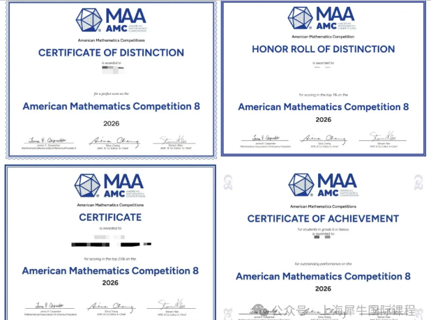 AMC8所有奖项证书均由美国数学协会(MAA)统一制作颁发,证书上不体现国别与分数线差异,仅显示考生所获得的相应奖项级别。