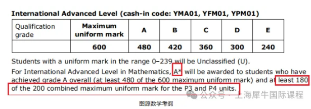 UMS总分至少480(总分600.达到80%以上);A2学年的P3和P4分数达到180(总分200.达到90%以上),则最终成绩为A*,但P3P4没有达到条件则只能拿到A。