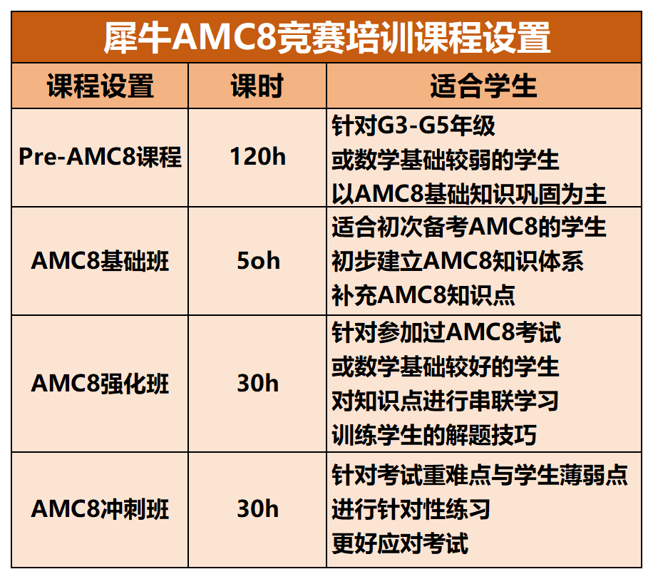 班型设置:AMC8直通车、优享班、强化班、基础班、冲刺班、模考班等。