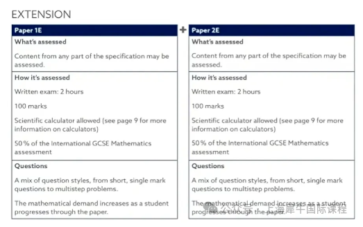 牛津AQA考试局的IGCSE数学课程设有(Core核心)与(Extension拓展)两个难度级别,其中拓展级别的考试难度较高。