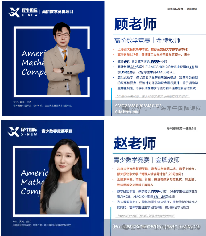 犀牛AMC培训课程师资均毕业于清华、北大、复旦、斯坦福、麻省理工等国内外顶尖院校,并且老师们多年来长居AMC竞赛教学一线。
