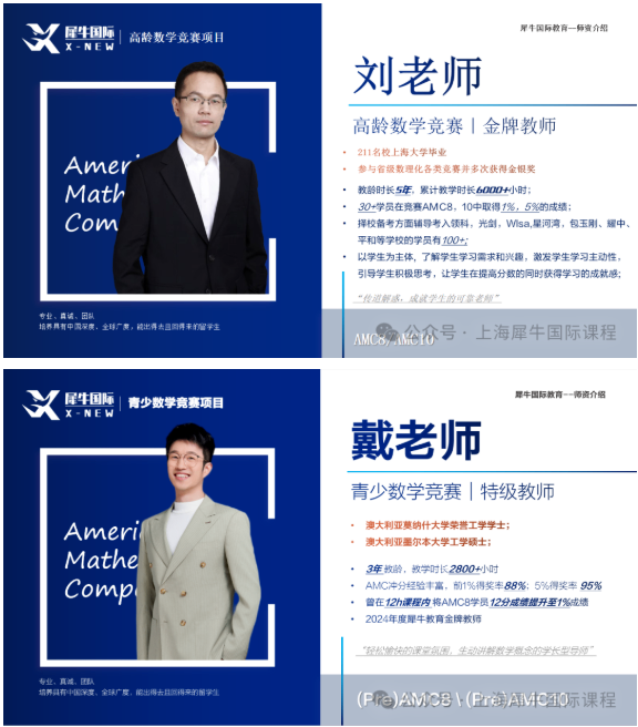教龄与经验:人均4-6年AMC10/AIME教学经验,累计授课时长2500-8000+小时,深耕 AMC命题规律与提分方法。