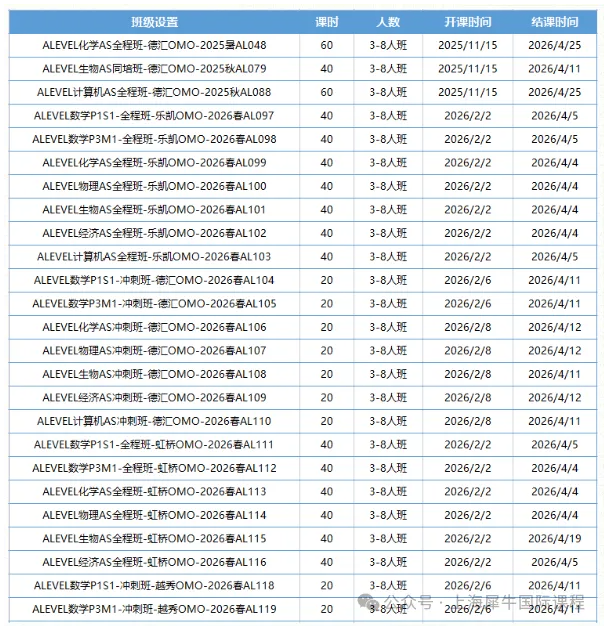 我们开设了Alevel数学P1S1、Alevel数学P3M1、Alevel高数FP1FS、Alevel物理、Alevel化学、Alevel生物、Alevel经济、Alevel计算机等科目。