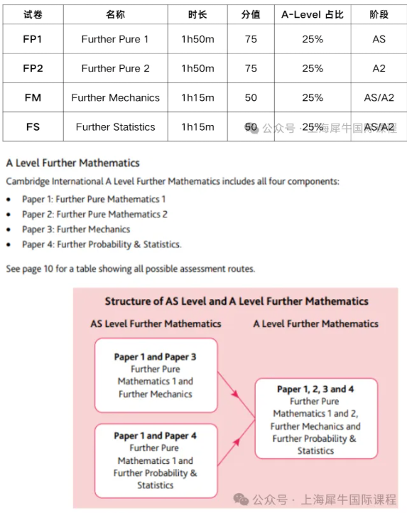 A-level高数同样考4张paper,AS阶段必须选择FP1.另外一个paper可以在Mechanics(P3)和Statistics(P4)中选择。其中,AS阶段必修FP1、A2必修FP2.以及FM和FS。