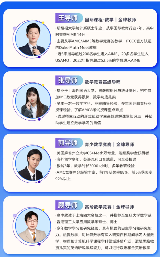 犀牛低龄数学竞赛授课师资汇集了海内外TOP院校的博士、硕士老师,包括:帝国理工、港理工、新加坡国立、伦敦大学,以及国内清北复交等等。