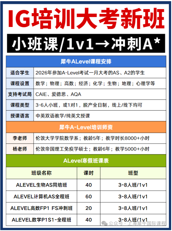 距离2026年5月IGCSE大考仅剩两月不到,很多同学也开始进入冲刺阶段了,涵盖数学、物理、化学、生物、经济、计算机等热门科目,师资实力雄厚,包括G5、藤校、港前三的硕博导师,线上线下同步开课,助力学生冲刺A*。