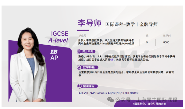 熟悉、ALEVEL、AP、IB等各类数学国际课程;多名学生在各类国际数学学科中获得成绩,超百名学生进入英国G5.美国常春藤等世界顶尖名校。